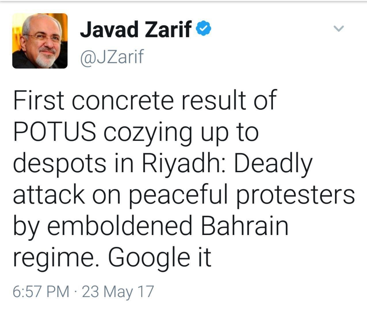 وی در توئیت خود نوشت: اولین نتیجه گرم گرفتن رییس جمهور آمریکا با دیکتاتورها در ریاض: حمله کشنده به تظاهرات صلحآمیز توسط رژیم جریشده بحرین. در گوگل جستجو کنید.