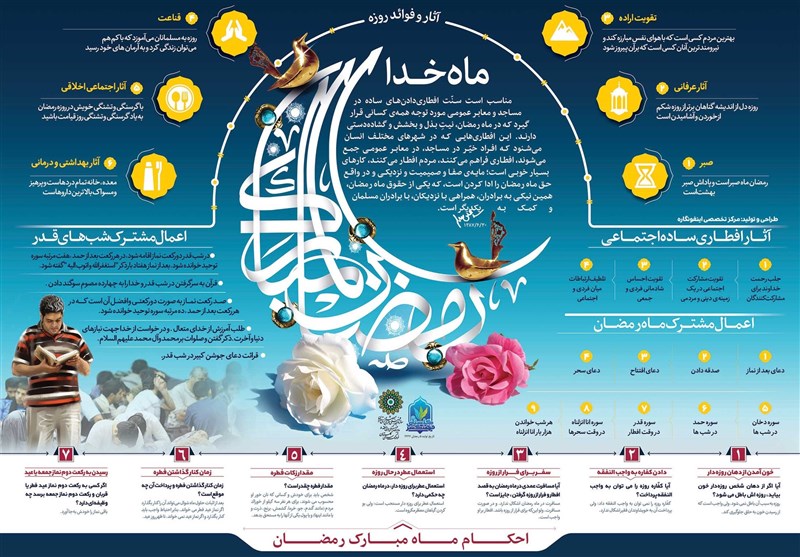 آثار و فوائد روزه، آثار افطاری ساده اجتماعی ، اعمال مشترک ماه رمضان و شب های قدر و احکام ماه مبارک رمضان از جمله موضوعات تشریح شده در اینفوگرافیک «ماه خدا»می باشد که به همت فرهنگسرای گلستان تبیین و تولید شده است. گفتنی است مجری طراحی و تولید این طرح مرکز تخصصی اینفونگاره می باشد.