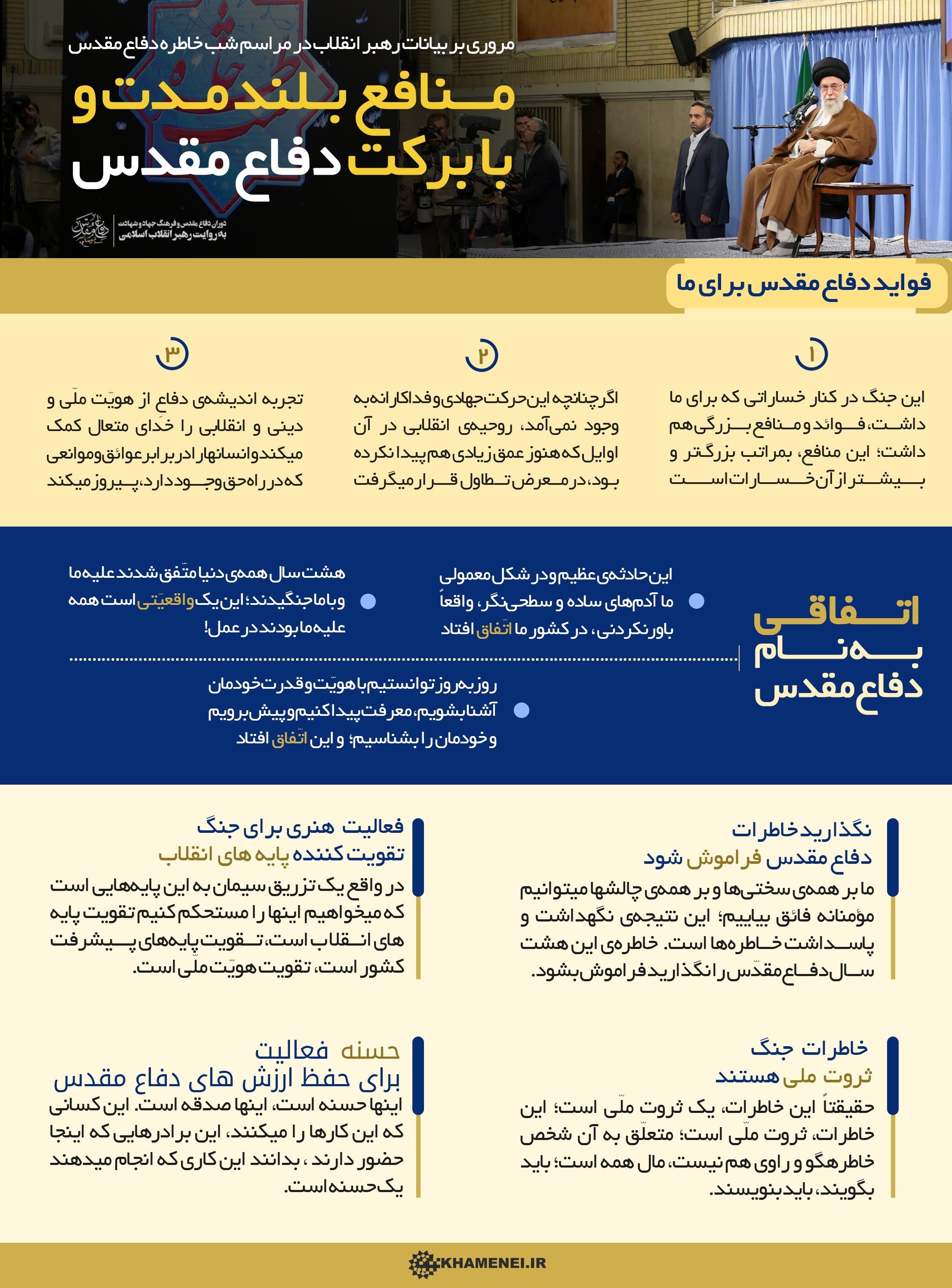 به گزارش باشگاه خبرنگاران پویا, اینفوگرافیک بیانات مقام معظم رهبری در مراسم شب خاطره دفاع مقدس با عنوان«منافع بلند مدت و با برکت دفاع مقدس» که سوم خرداد همزمان با سالروز عملیات آزادسازی خرمشهر با حضور جمعی از رزمندگان دوران دفاع مقدس در حسینیه امام خمینی(ره) برگزار شد, توسط دفتر حفظ و نشر آثار آیت الله خامنه ای منتشر شد.