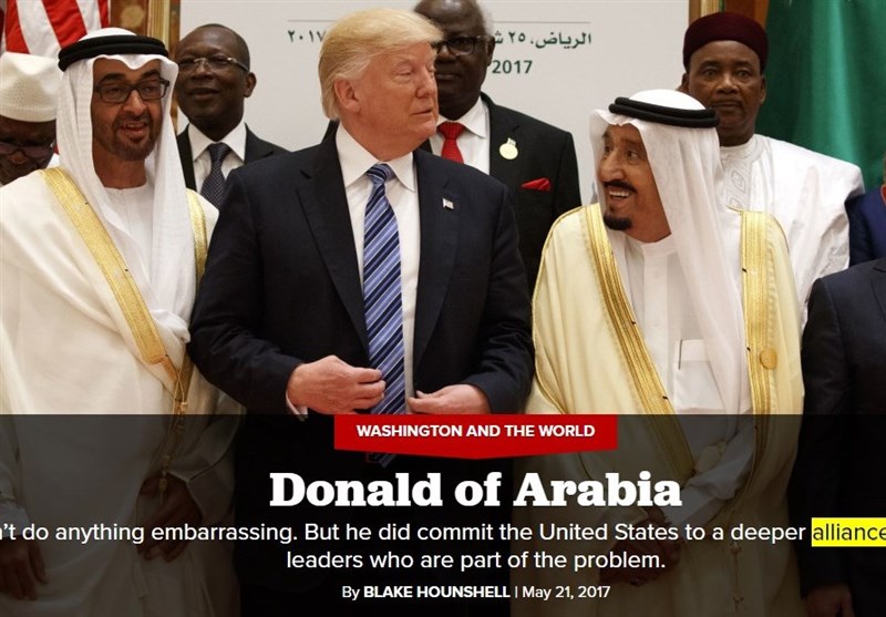 سفر رئیس جمهور آمریکا در 22 می از ریاض آغاز شد. قرارداد پر سروصدای 110 میلیارد دلاری فروش اسلحه برای 10 سال آینده از اهمیت ویژه ای برخوردار است. ماهیت این قرارداد شامل ناوشکن، تانک، ضد موشک، سیستم دفاع هوایی "تاد "، آمادگی برای مواجهه با ایران و بالانس کردن قدرت موشکی ایران است. بنا به گفته برخی تحلیلگران عربستان برای کاهش خسارت های انسانی ناشی از حملات کور خود به یمن بدنبال تسلیحات دقیق زن نیز بوده که با این قرارداد به آن دست یافته است.