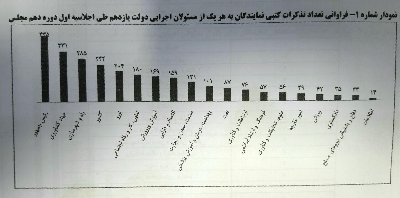 به گزارش خبرنگار پارلمانی خبرگزاری تسنیم، براساس گزارش معاونت نظارت مجلس شورای اسلامی، نمایندگان مجلس دهم از تاریخ 95.03.07 تا 15 اردیبهشت 96 در مجموع 2689 تذکر کتبی به رئیسجمهور و اعضای هیئت وزیران دادهاند که بیشترین تذکر با 435 فقره به رئیسجمهور و کمترین تذکر با 14 فقره به وزیر اطلاعات بوده است.