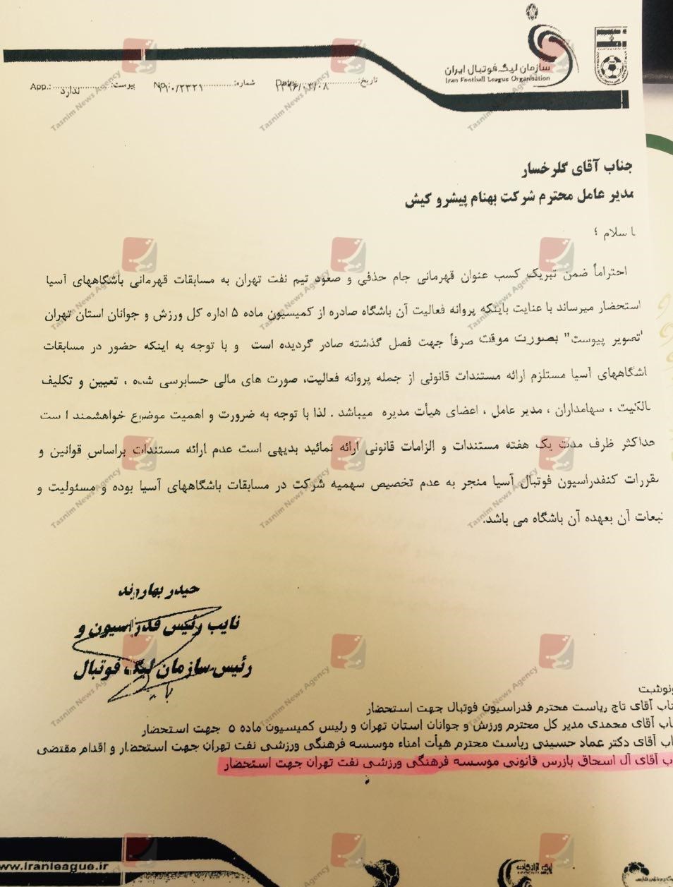 با این حال سازمان لیگ فوتبال ایران در نامه‌ای که دوشنبه، 8 خردادماه به گل‌رخسار، مدیرعامل شرکت بهنام پیشرو کیش و مالک باشگاه نفت تهران ارسال کرده، تذکری جدی داده که در صورت عدم ارائه مستندات از جمله پروانه فعالیت حرفه‌ای سهمیه لیگ قهرمانان آسیا به این باشگاه تخصیص داده نمی‌شود. نفتی‌ها با این نامه سازمان لیگ که به امضای حیدر بهاروند، رئیس سازمان لیگ رسیده فقط یک هفته (تا 15 خردادماه) فرصت دارند که مستندات و الزامات قانونی خود را به سازمان لیگ ارائه کنند، در غیر این صورت ابتدا سهمیه آسیایی آنها حذف خواهد شد و به تیم دیگری داده می‌شود و پس از آن حتی احتمال انحلال این باشگاه نیز وجود دارد.