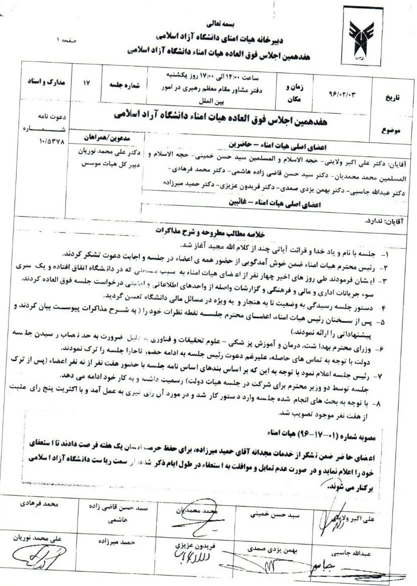 تصویر صورتجلسه عزل رئیس سابق دانشگاه آزاد در خبرگزاری تسنیم منتشر شد.