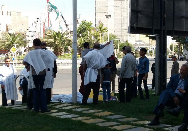 از حدود ساعت 9:30 دقیقه مردم در گوشه و کنار میدان امام حسین (ع) ورامین نشستهاند تا سایرین از راه برسند، خانمی در گوشهای جزء قرآنش را میخواند و خانم جوانی همراه با کالسکه کودکش از راه میرسد، گوشه دیگر میدان تعدادی در حال پوشیدن کفنها هستند همانهایی که در راهپیمایی در صف اول جمعیت حرکت کردند و اولینها بودند در حضور، گویا السابقونی هستند که جان بر کف در وسط میدان آماده اشاره رهبر ایستادهاند.