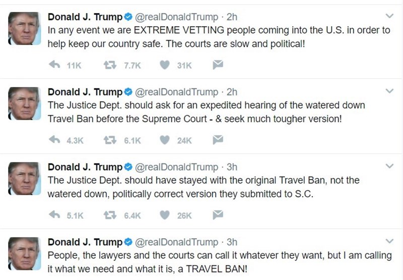 ترامپ نوشت: در هر صورت، ما در حال بررسی شدید مردمی هستیم که به آمریکا می آیند تا به حفظ امنیت کشورمان کمک کنیم. دادگاه ها کند و سیاسی شده اند. وزارت دادگستری باید نسخه اصلی ممنوعیت مسافرتی را حفظ کند و نه نسخه تضعیف و تصحیح شده سیاسی آن را.