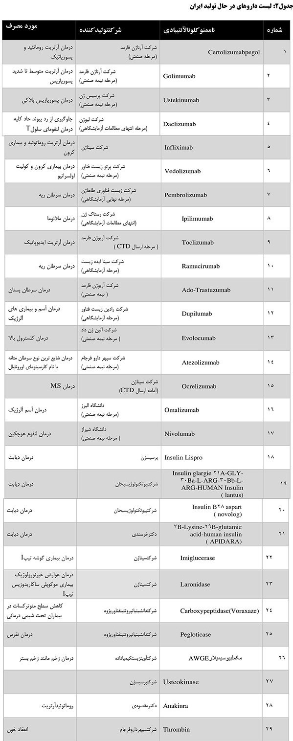 اسامی داروهای زیست فناوری تولید ایران و نیز داروهایی که در مراحل مختلف تولید (قبل از نهایی شدن) هستند، همراه با موارد مصرف در جدول زیر آمده است: