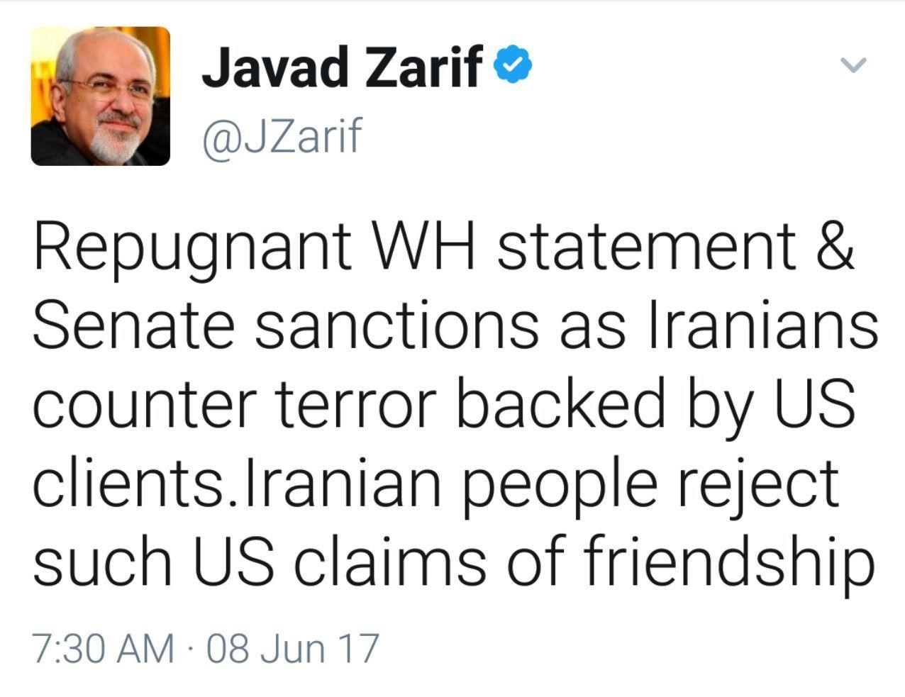 دکتر ظریف در توئیت خود نوشت: بیانیه کاخ سفید و تحریمهای سنا متناقض و زنندهاند؛ ایران با تروریستهایی مقابله میکند که توسط مشتریان آمریکا حمایت میشوند. مردم ایران ادعای دوستی اینچنینی آمریکا را نمیپذیرند.