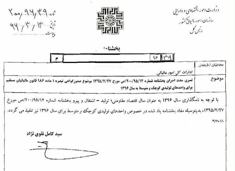 ضمنا لازم به توضیح است واحدهای تولیدی فوق مکلفند صورتهای مالی که به سازمان امور مالیاتی کشور ارائه نموده اند را برای اخذ تسهیلات به بانکها و موسسات مالی و اعتباری مجاز ارائه نمایند.
