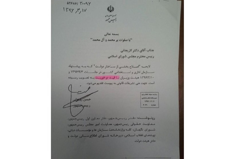 حسن روحانی 17 اردیبهشت ماه سال جاری با ارسال نامه ای به علی لاریجانی رییس مجلس اعلام کرد: «لایحه «اصلاح بخشی از ساختار دولت» که به پیشنهاد سازمان اداری و استخدامی کشور در جلسات 1396/3/3 و 1396/3/10 هیئت وزیران با قید دو فوریت به تصویب رسیده است، جهت طی تشریفات قانونی به پیوست تقدیم می‌شود.»