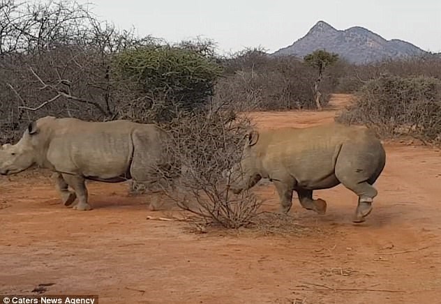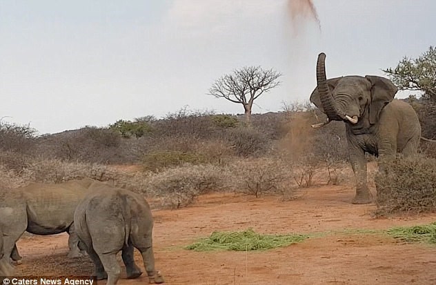 بر اساس گزارش میل آنلاین، یک فیل که وعده غذایی ناهارش توسط سه کرگدن تهدید شده بود به شیوه خاص خود برای آنها خط و نشان کشید و در نهایت آنها را وادار به فرار کرد.