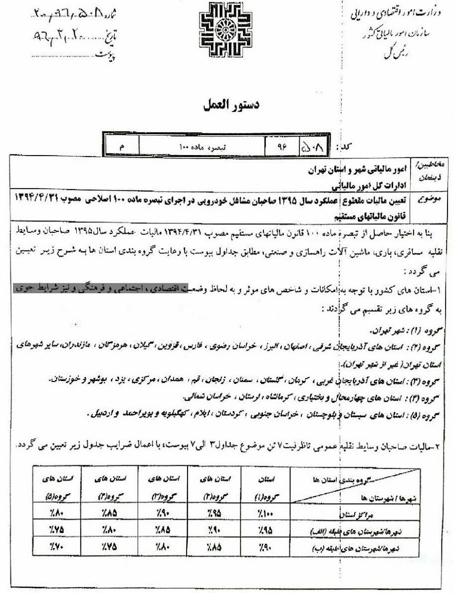 به گزارش خبرنگار اقتصادی باشگاه خبرنگاران پویا؛ بر اساس بخشنامه سازمان مالیاتی، بنا به اختیار حاصل از تبصره ماده 100 قانون مالیاتهای مستقیم، مالیات عملکرد سال 95، صاحبان وسائط نقلیه مسافری، باری، ماشین آلات راهسازی و صنعتی مطالبق جداول زیر میباشد. در تقسیم بندی انجام شده از سوی سازمان مالیاتی 5 گروه عمده شامل شهر تهران، 2-استانهای آذربایجان شرقی، البرز و... 3-استانهای آذربایجان غربی، کرمان، گلستان و...4-استانهای چهارمحال، کرمانشاه و لرستان و...5-استانهای سیستان، خراسان جنوبی، کردستان، ایلام و...در نظر گرفته شده است.