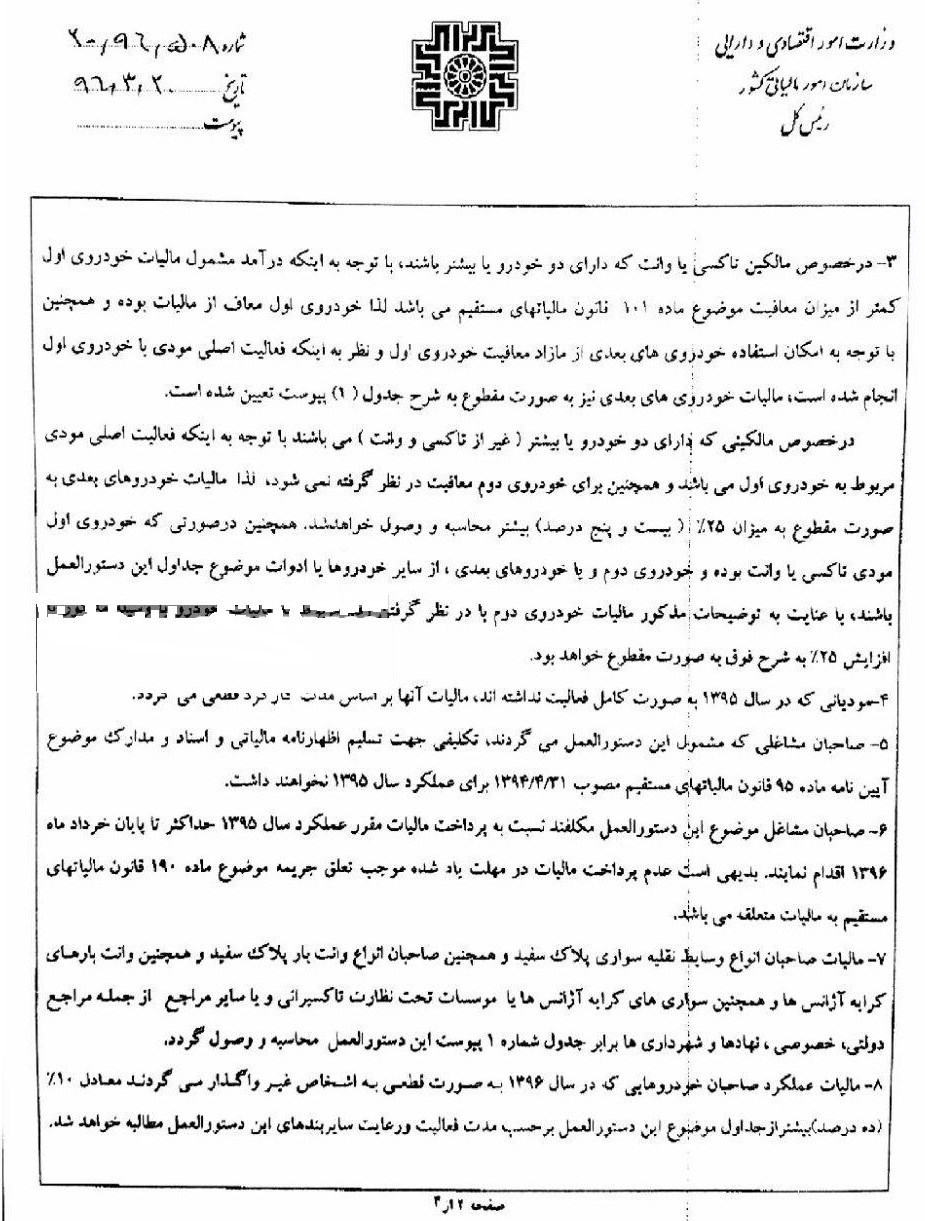 در این بخشنامه تاکید شده است، مالکین تاکسی یا وانت که دارای دو خودرو یا بیشتر باشند، خودروی اول معاف از مالیات خواهد بود.