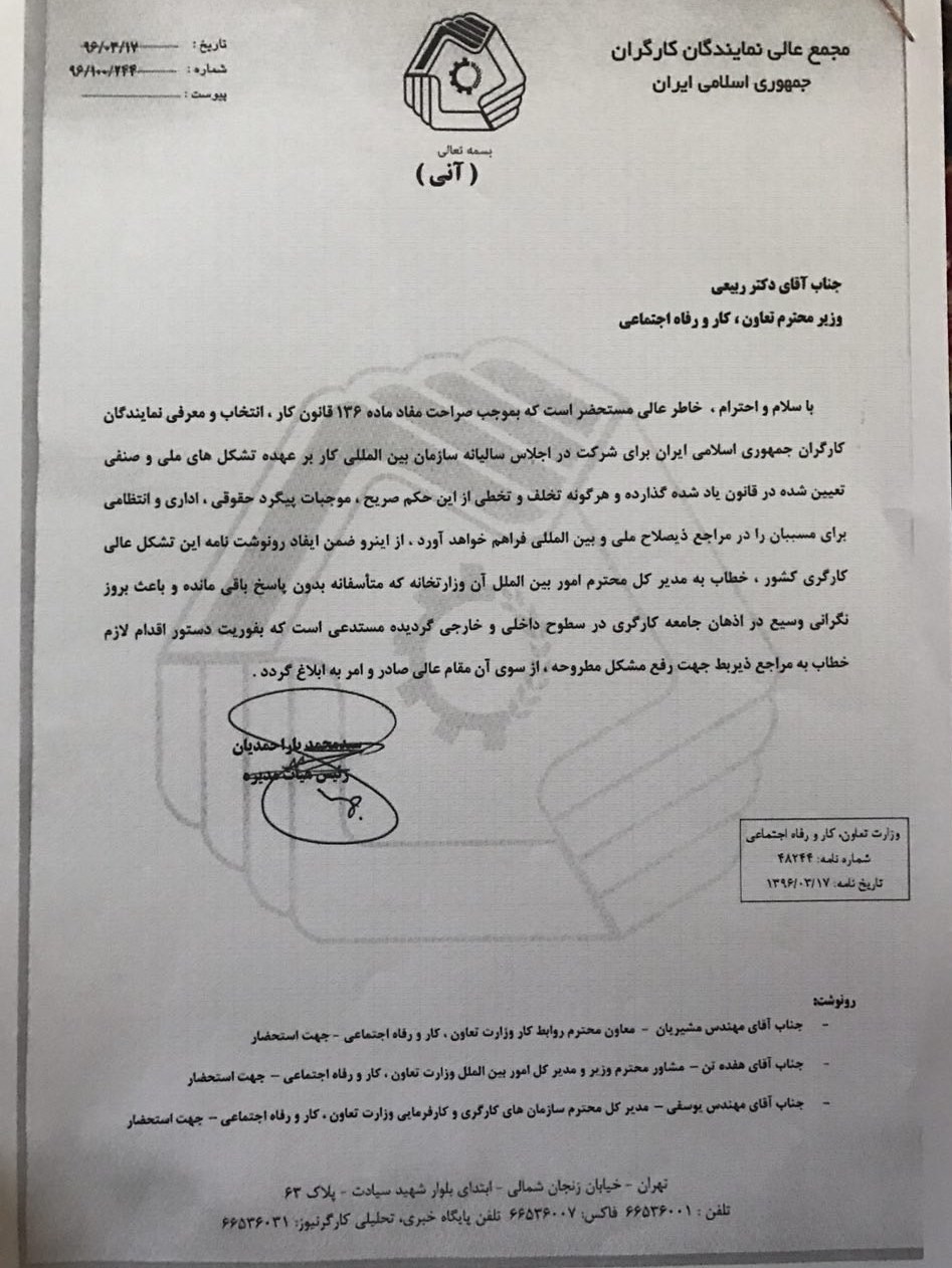 از این رو ضمن ایفاد رونوشت نامه این تشکل عالی کارگری کشور، خطاب به مدیر کل محترم امور بین الملل آن وزارتخانه که متأسفانه بدون پاسخ باقی مانده است و باعث بروز نگرانی وسیع در اذهان جامعه کارگری در سطوح داخلی و خارجی شده است مستدعی است که به فوریت دستور اقدام لازم خطاب به مراجع ذیربط به جهت رفع مشکل مطروحه از سوی آن مقام عالی صادر و امر به ابلاغ گردد. "