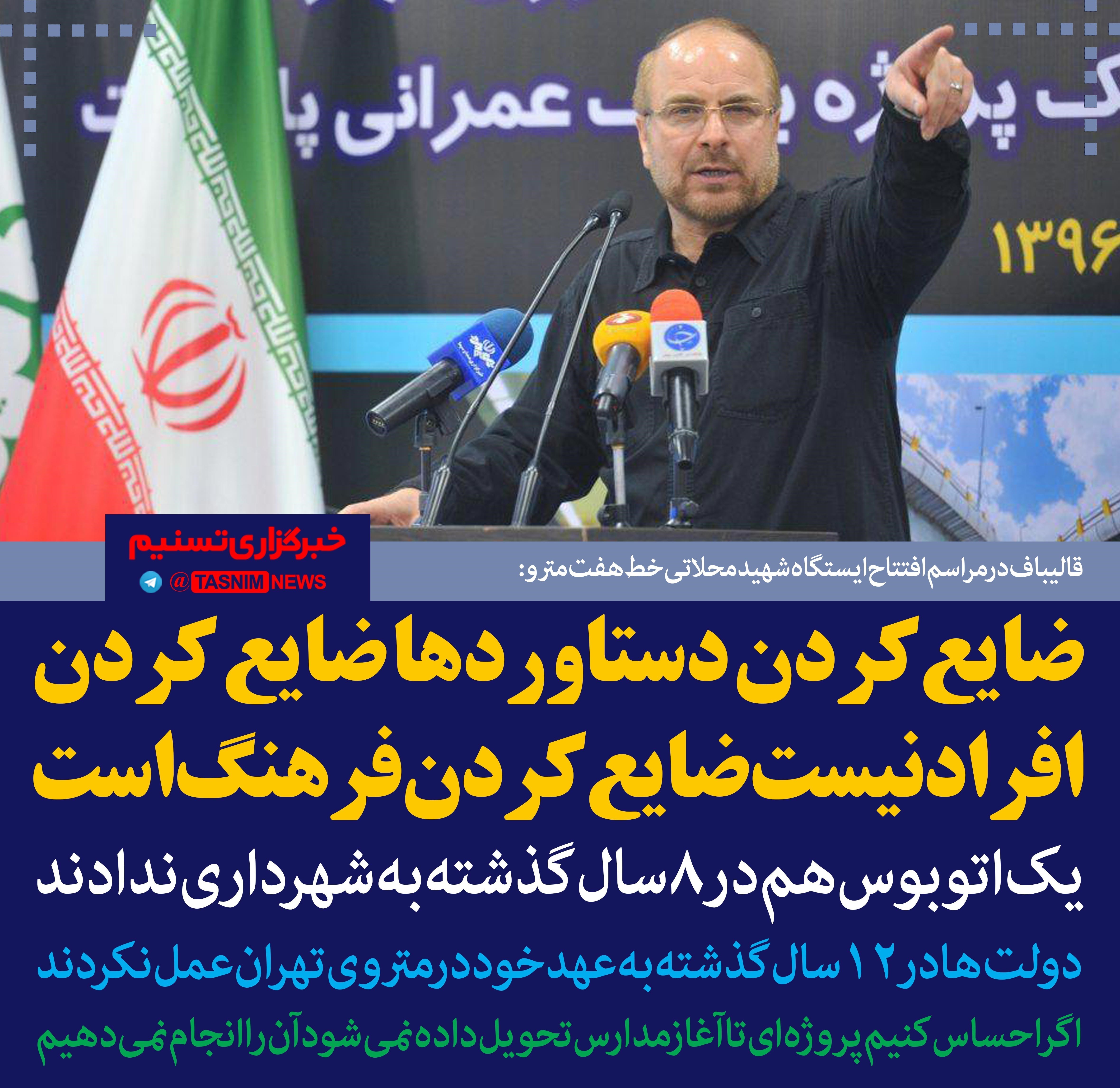 قالیباف در مراسم افتتاح ایستگاه شهید محلاتی گفت:اینکه دستاوردهایی که به دست آمده را ضایع کنیم ضایع کردن یک فرد نیست بلکه ضایع کردن یک فرهنگ است.