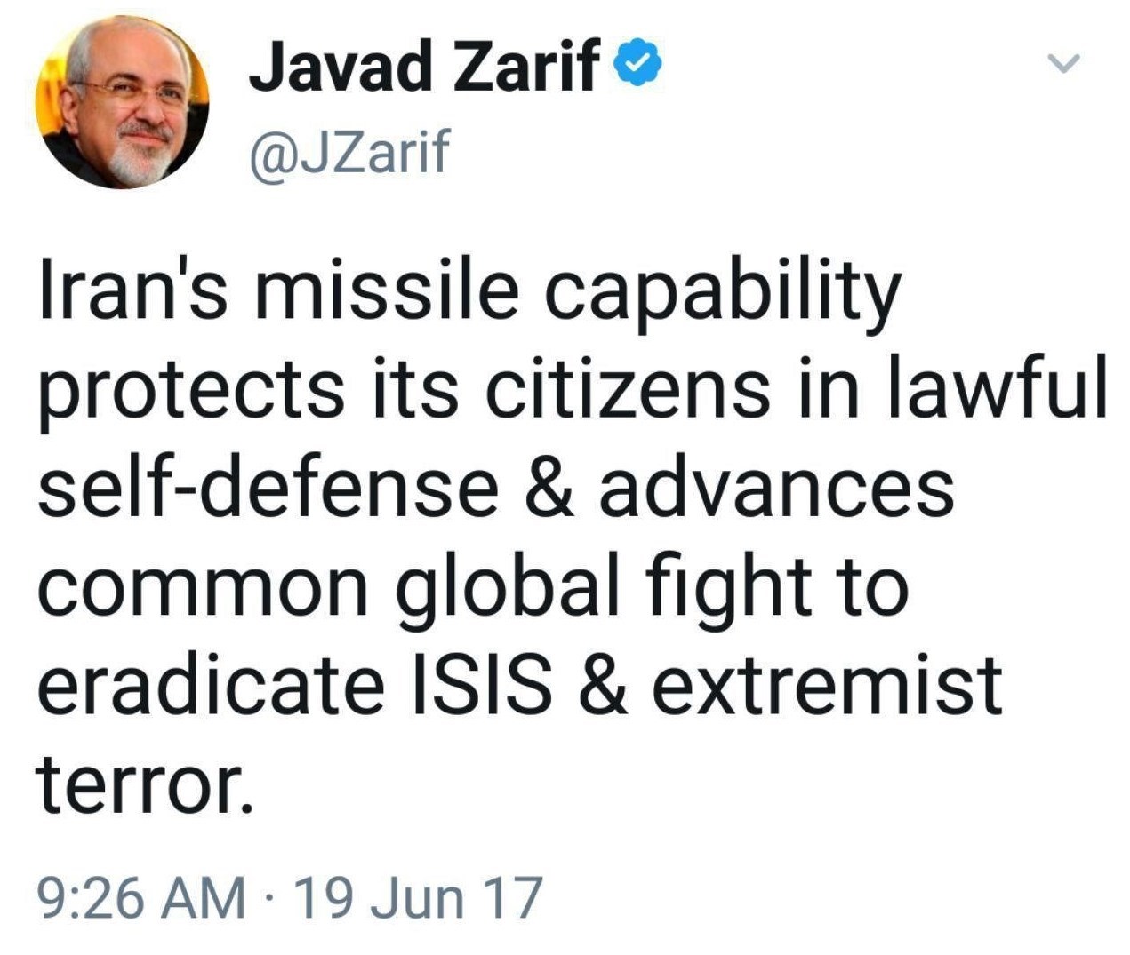 به گزارش گروه بینالملل خبرگزاری تسنیم، محمد جواد ظریف، وزیر امور خارجه کشورمان پس از حمله موشکی به مواضع تروریستهای داعش در دیرالزور در پیامی توییتری نوشت: «توان موشکی ایران از شهروندانش در دفاع مشروع و قانونی حمایت میکند و همزمان مبارزه مشترک جهانی با داعش و تروریزم افراطگرا را به پیش میراند».