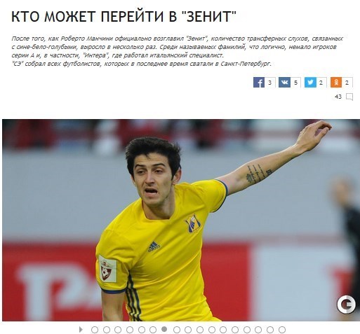 این رسانه معتبر ورزشی روسیه سپس به نقل از اخبار پیرامونی باشگاه زنیت سن پترزبورگ اسامی و تصاویر 17 بازیکنی را منتشر کرد که احتمال خرید آنها از سوی این باشگاه متمول روسی وجود دارد. مارسلو بروزوویچ، هافبک کروات تیم اینتر میلان در صدر این فهرست قرار دارد. سردار آزمون، ملیپوش ایرانی تیم روستوف نیز از سوی روزنامه اسپورت اکسپرس روسیه پس از بروزوویچ دومین خرید احتمالی زنیت سن پترزبورگ است. آرماندو ایزو (ناپل)، جیسون موریلو (اینتر میلان)، لئاندرو پاردس (رم) و بسیاری دیگر از بازیکنان سری A ایتالیا در این فهرست جای دارند.