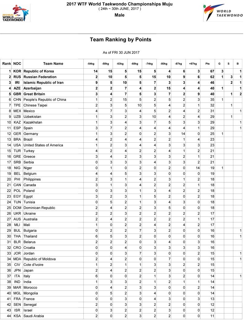 جدول ردهبندی بیست و سومین دوره رقابتهای جهانی تکواندو را در زیر مشاهده میکنید.