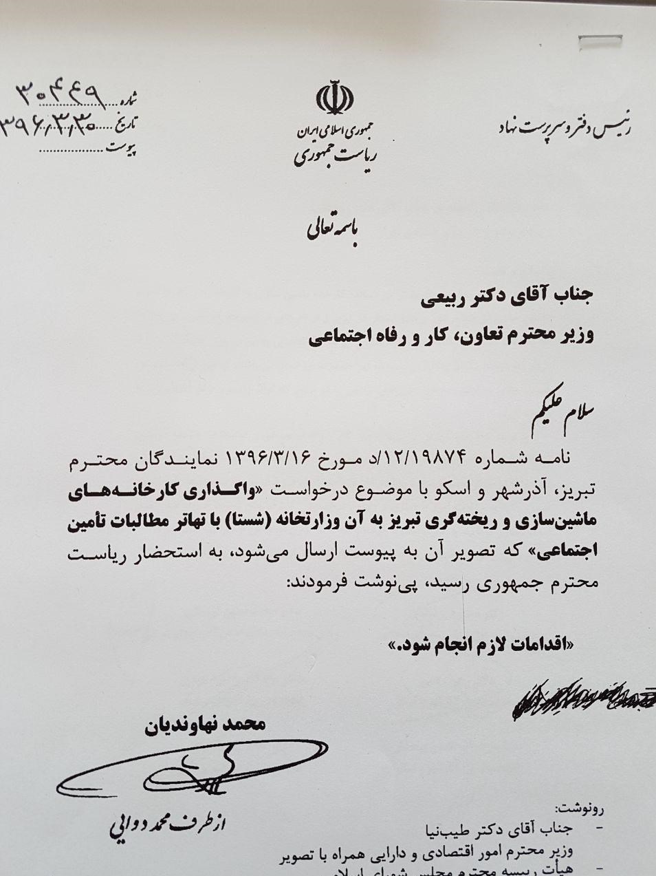 روحانی در این نامه که 30 خرداد ماه 96 یعنی 10 روز پیش خطاب به وزیر کار به عنوان مالک سازمان تامین اجتماعی و شرکت سرمایه گذاری تامین اجتماعی (شستا) در پاسخ به نامه نمایندگان مردم تبریز، اسکو و آذرشهر در مجلس شورای اسلامی مبنی بر «واگذاری کارخانه های ماشین سازی و ریخته گری به شستا با تهاتر مطالبات تامین اجتماعی» دستور داده تا «اقدام شود».