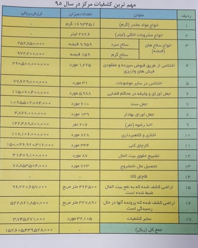 بر اساس این گزارش، ارزش ریالی مجموع کشفیات این مرکز در سال گذشته، 152 هزار و 605 میلیارد و 439 میلیون و 528 هزار ریال (152.605.439.528.000) بوده است.