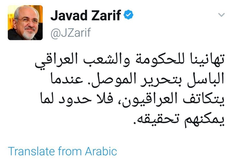 به گزارش گروه بینالملل خبرگزاری تسنیم، محمد جواد ظریف، وزیر امور خارجه ایران طی پیامی به زبان عربی در صفحه توتیر خود پیروزی ملت عراق در شکست گروه تروریستی داعش در موصل را تبریک گفت.