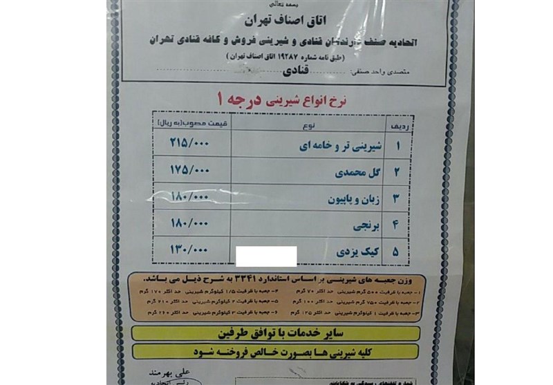 در این اعلامیه آمده است نرخ هر کیلوگرم "شیرینی تر و خامهای" 21 هزار و 500تومان، "گل محمدی" 17 هزار و 500 تومان، "زبان و پاپیون" و "برنجی" 18 هزار تومان و "کیک یزدی" 13 هزار تومان است که باید بهصورت خالص و بدون احتساب وزن جعبه فروخته شود.