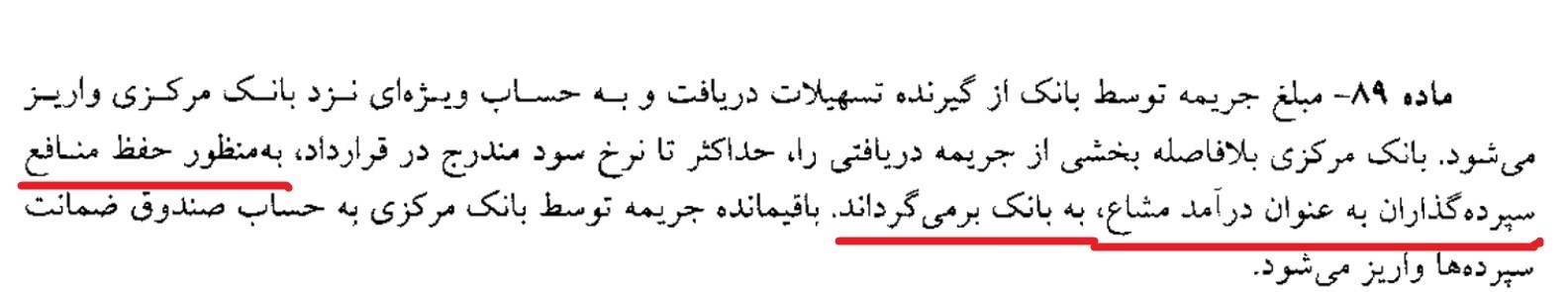 اما این راه حل در ماده 89 پیش نویس طرح جامع بانکداری جمهوری اسلامی ایران، به تناقضی عجیب دچار شده و واریز وجوه حاصل از تاخیر تادیه از حساب بانکها به حساب بانک مرکزی به صورت صوری انجام می شود . بدین صورت که وجوه جریمه دیرکرد ابتدا از حساب بانکها به حساب بانک مرکزی واریز می شود و سپس این وجوه با توجیه «حفظ منافع سپرده گذاران» با کمال تعجب دوباره از حساب بانک مرکزی به حساب بانکها منتقل می شود.