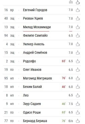 میلاد محمدی، ملیپوش ایرانی تیم احمد گروژنی که حضور 90 دقیقهای در میدان داشت از سوی خبرگزاری ورزشی چمپیونات روسیه و کاربرانش با نمره فنی خوب 7 مواجه شد. سعید عزتاللهی، بازیکن تیم روستوف هم همانند هفته اول لیگ برتر روسیه روی نیمکت ذخیرهها نشست و جایی در ترکیب اصلی نداشت.