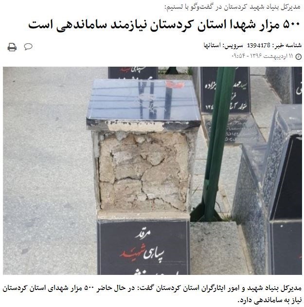 وضعیت کنونی برخی از مزارهای شهدا و نیاز آنها به مرمت و بازسازی به هیچ‌وجه شایسته فداکاری و رشادت‌های شهیدان خطه کردستان نیست و همین موضوع سبب نگرانی مردم استان شده است.