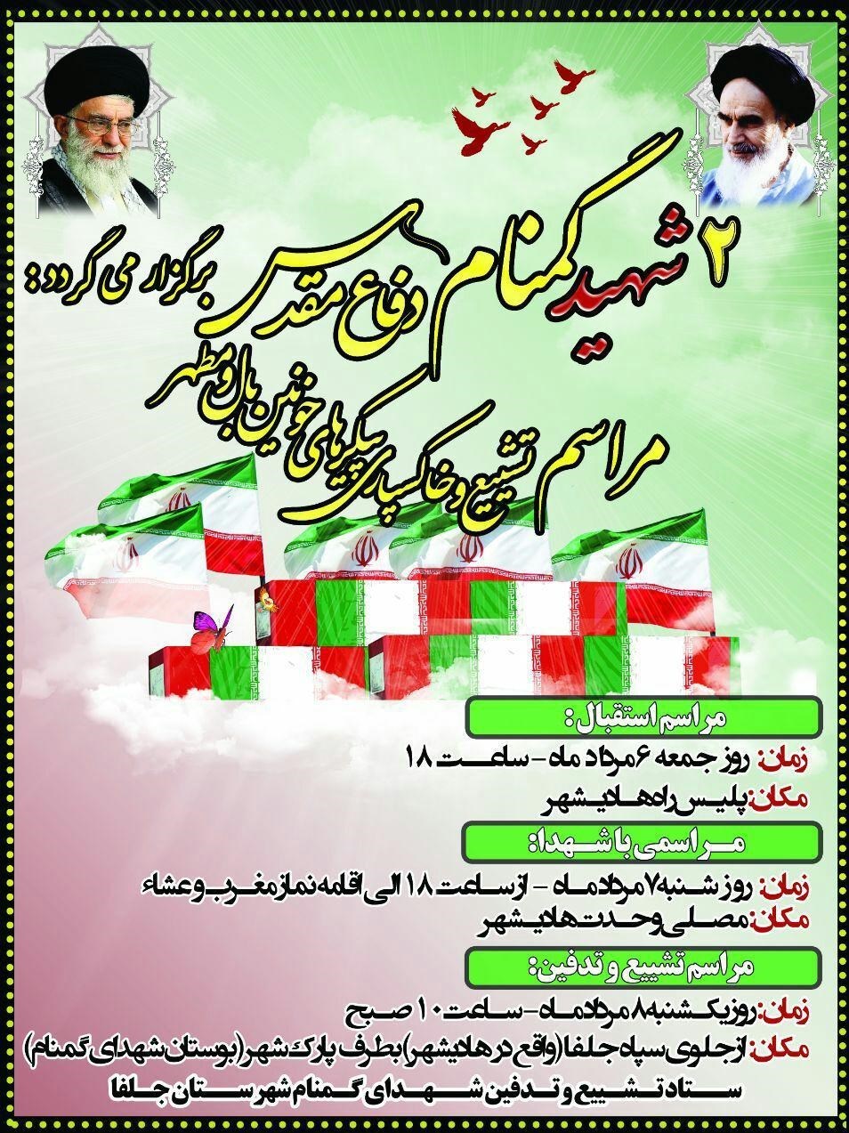 به گزار خبرگزاری تسنیم از جلفا، پیکر پاک و مطهر 2 شهید گمنام دوران هشت سال دفاع مقدس در شهر هادی شهر شهرستان جلفا تشییع میشوند.