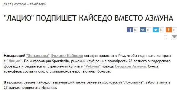 به گزارش خبرگزاری تسنیم، سایت اسپورت روسیه به نقل از فوتبال ایتالیا نوشت: فلیپه کائیسدو، مهاجم 28 ساله اهل اکوادور امروز به سمت رم، پایتخت ایتالیا پرواز می‌کند تا با باشگاه لاتزیو قراردادش را منعقد کند. باشگاه لاتزیو پس از انصراف از خرید سردار آزمون،ملی‌پوش ایرانی تیم روبین‌کازان تصمیم به جذب مهاجم اکوادوری اسپانیول با هزینه 5 میلیون یورویی گرفت.