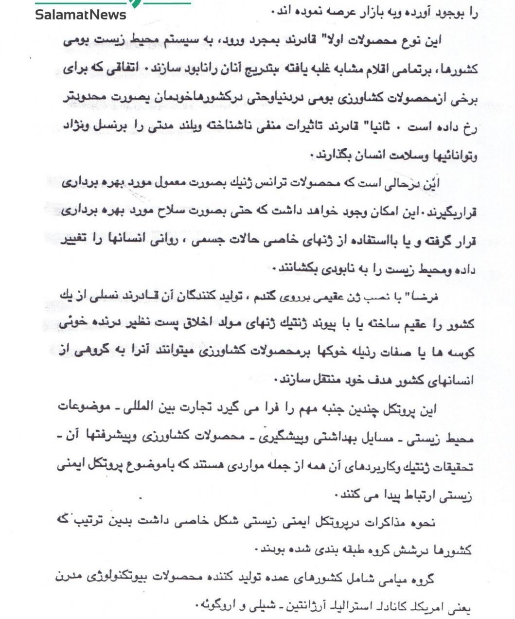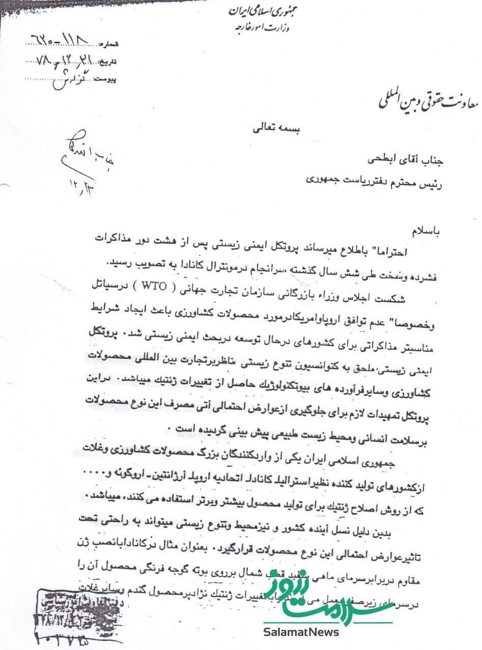 احتراماً نظر به استناد برخی از رسانههای گروهی به نامه شانزده سال قبل وزارت امور خارجه درخصوص محصولات تراریخت اشعار میدارد: