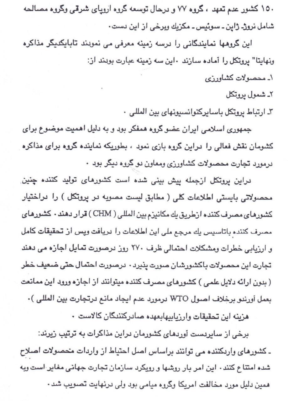 جمهوری اسلامی ایران عضو گروه همفکر بوده و بهدلیل اهمیت موضوع برای کشورمان نقش فعالی در این گروه بازی نمود، بهطوری که نماینده گروه برای مذاکره در مورد تجارت محصولات کشاورزی و معادن دو گروه دیگر بود. در این پروتکل از جمله پیشبینی شده است کشورهای تولیدکننده چنین محصولاتی باید اطلاعات کلی (مطابق لیست مصوبه در پروتکل) را در اختیار کشورهای مصرفکننده از طریق یک مکانیزم بین المللی (CHM) قرار دهند. کشورهای مصرفکننده با تأسیس یک مرجع ملی این اطلاعات را دریافت و پس از تحقیقات کامل و ارزیابی خطرات و مشکلات احتمالی ظرف 270 روز در صورت تمایل اجازه میدهند تجارت این محصولات با کشورشان صورت پذیرد. در صورت احتمال حتی ضعیف خطر (بدون ارائه دلایل علمی) کشورهای مصرفکننده میتوانند از اجازه ورود ممانعت به عمل آورند و برخلاف اصول WTO در مورد عدم ایجاد مانع در تجارت بینالمللی. هزینه این تحقیقات و ارزیابیها بهعهده صادرکنندگان کالاست.