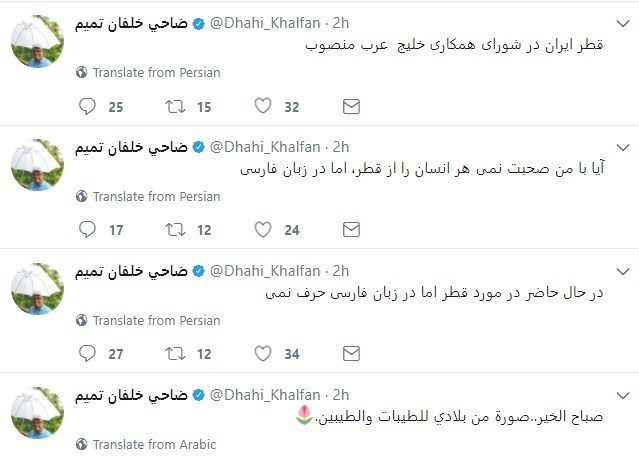 به گزارش گروه بینالملل خبرگزاری تسنیم، «ضاحی خلفان تمیم»، جانشین رئیس پلیس «دبی»، امروز، یکشنبه در حساب کاربری تأیید شدهاش در توئیتر پیامهایی نامفهوم به زبان فارسی منتشر کرد.