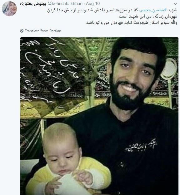 به گزارش گروه رسانه های خبرگزاری تسنیم، بهنوش بختیاری بازیگر سینما و تلویزیون در واکنش به شهادت محسن حججی شهید مدافع حرم در سوریه در توئیتر نوشت: شهید محسن حججی که در سوریه اسیر داعش شد و سر از تنش جدا کردن قهرمان زندگی من این شهید است ولله سوپر استار هیچوقت نباید قهرمان من و تو باشد.