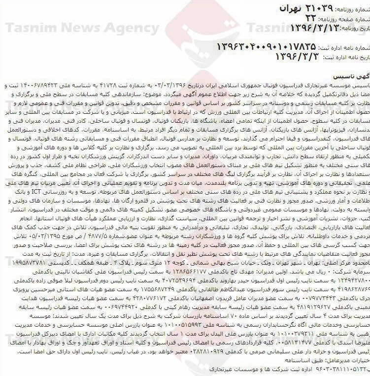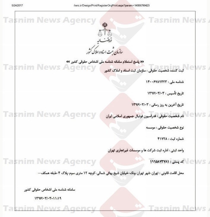 طبق آنچه در برنامه «پرونده» رادیو ورزش، امروز عنوان شد، فدراسیون فوتبال در زمان ریاست مهدی تاج تصمیم به ثبت این فدراسیون بهعنوان یک شرکت خصوصی گرفته است. این اتفاق در شرایطی رقم خورده که مسائلی عجیب در این رخداد بسیار مهم دیده میشود. اولین اتفاق عجیب در این ماجرا تاریخ تأسیس فدراسیون فوتبال است. فدراسیون فوتبال ایران در تاریخ 12 اسفندماه 1325 تأسیس شد و 30 بهمن 1326 به عضویت فیفا درآمد، اما مشخصاتی که برای ثبت آن به سازمان ثبت اسناد و املاک کشور ارسال شده، تاریخ تأسیس 1396/03/03 (سوم خردادماه 1396) را نشان میدهد، یعنی فدراسیون تحت امر مهدی تاج بیش از 70 سال از سابقه این فدراسیون را نادیده گرفته و اکنون دوماهه و بهنوعی شیرخواره است!