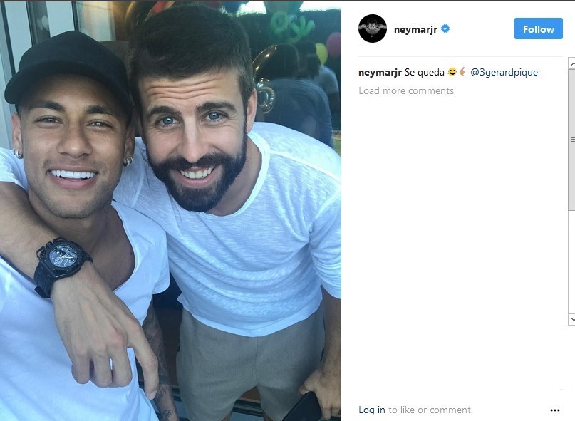 یکی از عکسهای جالب سفر این دو بازیکن برزیلی به کاتالونیا، عکس نیمار در کنار جرارد پیکه است. این عکس شبیه همان عکسی است که پیکه قبل از قطعی شدن انتقال نیمار به پاریس در صفحه اینستاگرامش در کنار جمله «او میماند» گذاشت و بعدها به سوژه تمسخر رسانهها و کاربران شبکههای اجتماعی تبدیل شد. جالب اینجاست که نیمار در کنار عکس جدیدش با پیکه همان جمله معروف «Se queda» به معنای میماند را نوشته است.