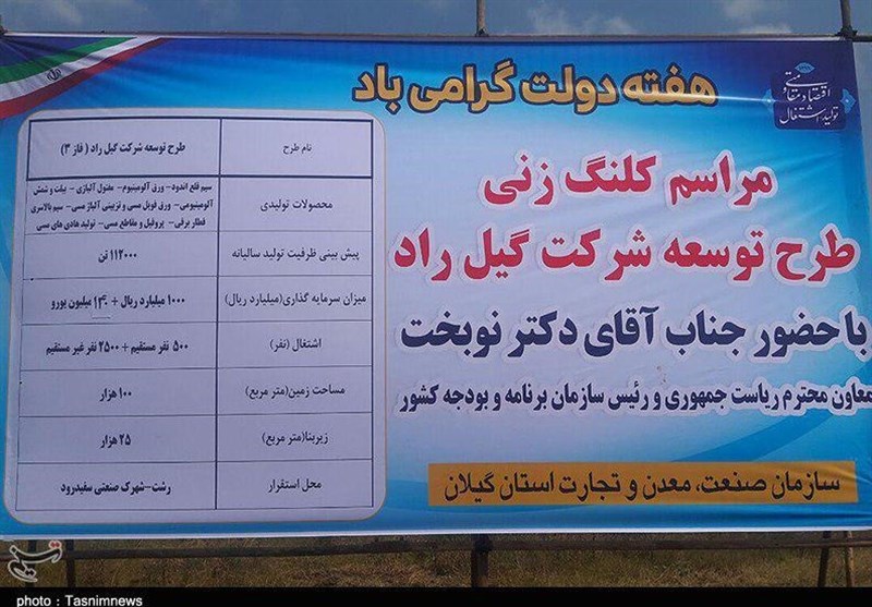 به گزارش خبرگزاری تسنیم از رشت، محمدباقر نوبخت معاون رئیس جمهور و رئیس سازمان برنامه و بودجه کشور پیش از ظهر امروز طرح توسعه شرکت گیلراد را در شهر صنعتی سفیدرود رشت کلنگ زد.