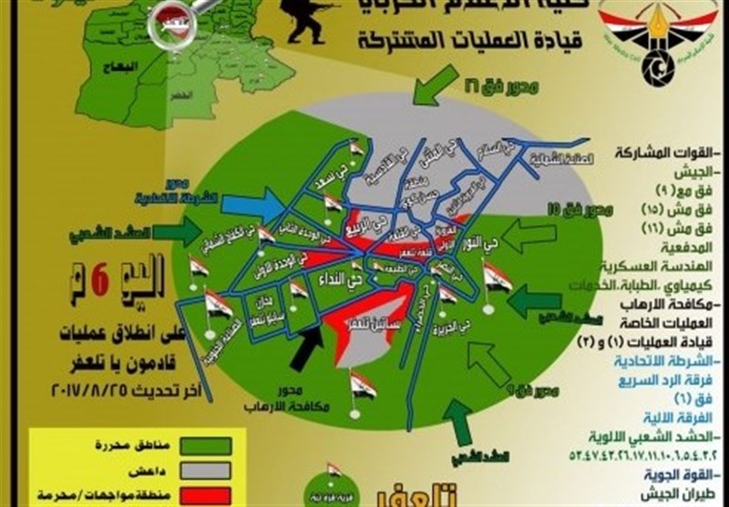 نیروهای ارتش عراق نیز محلات الجزیره الجنوبی، الجزیره الشمالی، الخضراء، التنک، النور الاولی، النور الثانی، النصر و العروبة‌ الاولی در شرق تلعفر را آزاد کردند و محلات حسن کوی، العروبة الثانیه، المثنی الاولی، المثنی الثانیة، السلام، منطقة‌ البواری و الصناعة الشمالیة همچنان تحت اشغال داعشی‌ها است.