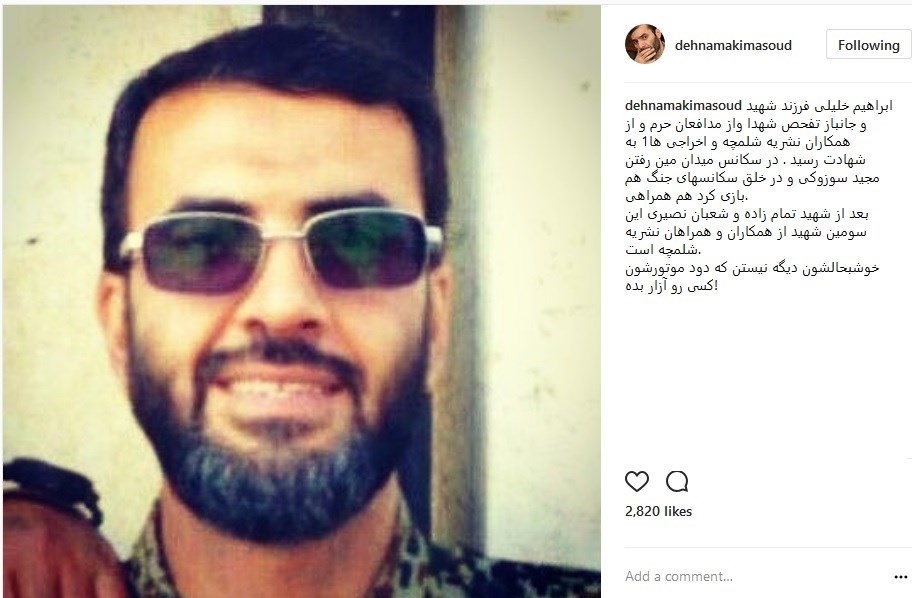 او نوشته است: «ابراهیم خلیلی فرزند شهید و جانباز تفحص شهدا واز مدافعان حرم و از همکاران نشریه شلمچه و اخراجی ها1 به شهادت رسید . در سکانس میدان مین رفتن مجید سوزوکی و در خلق سکانسهای جنگ هم بازی کرد هم همراهی.