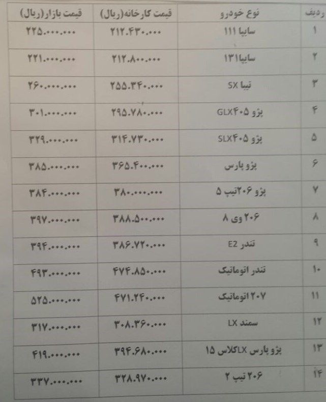 قیمت امروز انواع خودروی داخلی در بازار به شرح زیر است: