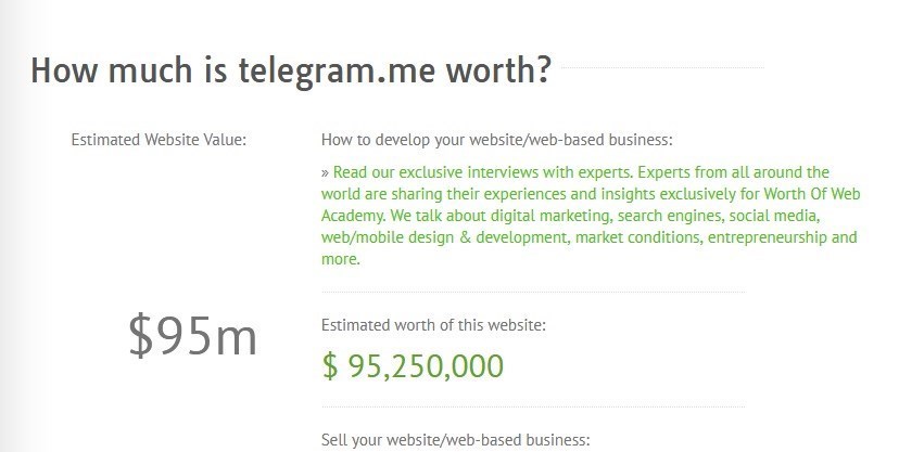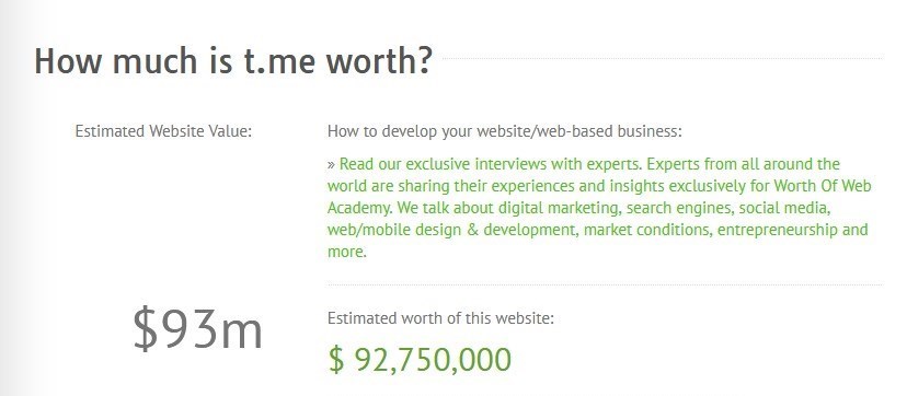 حال به سراغ دامنه دوم با عنوان telegram.me خواهیم رفت. بر اساس آمار الکسا 70% از ترافیک این دامنه متعلق به ایران بوده و Worth Of Web Academy، ارزش این دامنه را 95,250,000 دلار معادل 381,000,000,000 تومان تخمین زده است.