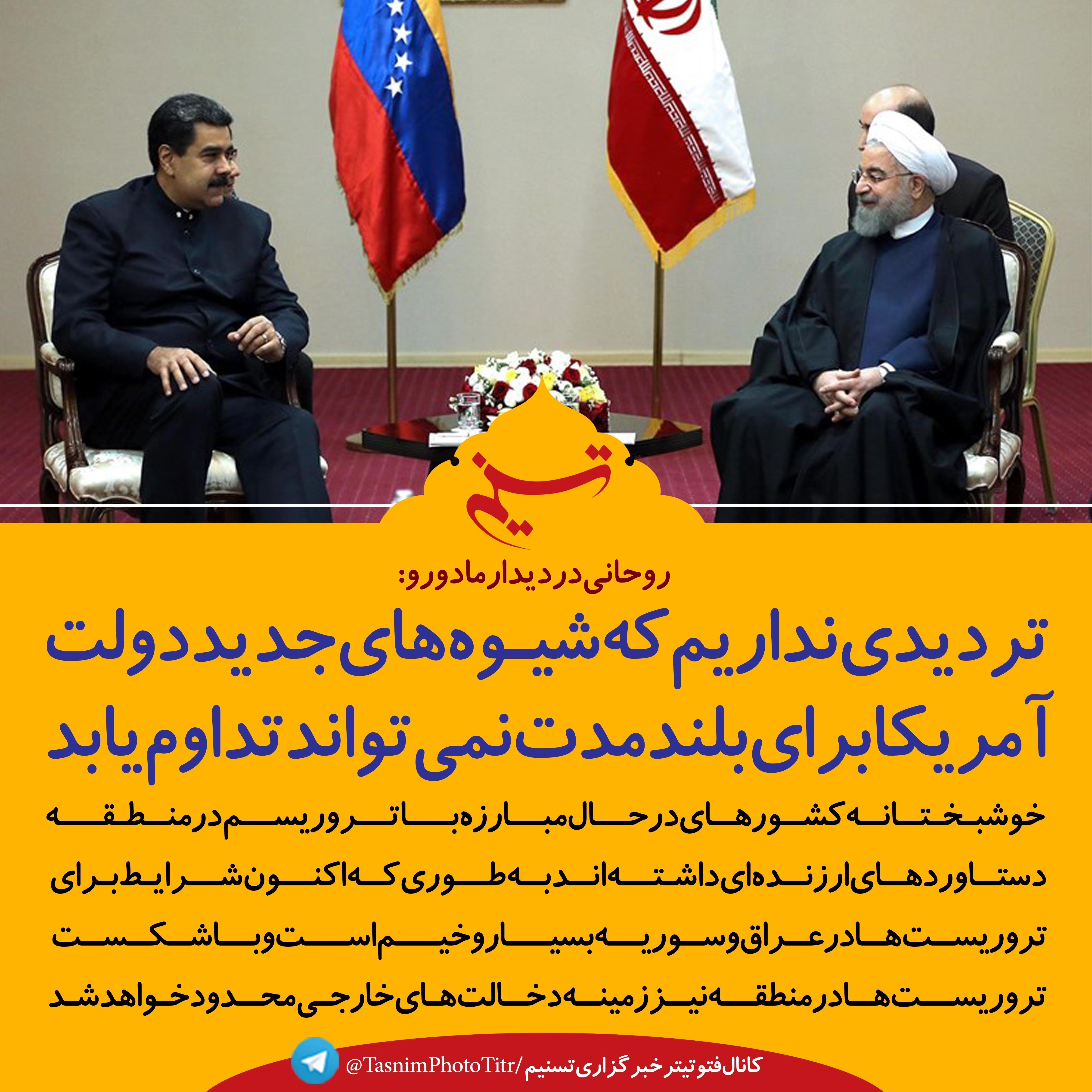 رئیس‌جمهور در دیدار رئیس‌جمهور ونزوئلا گفت: تردیدی نداریم که شیوه‌های جدید دولت آمریکا برای بلندمدت نمی‌تواند تداوم یابد.