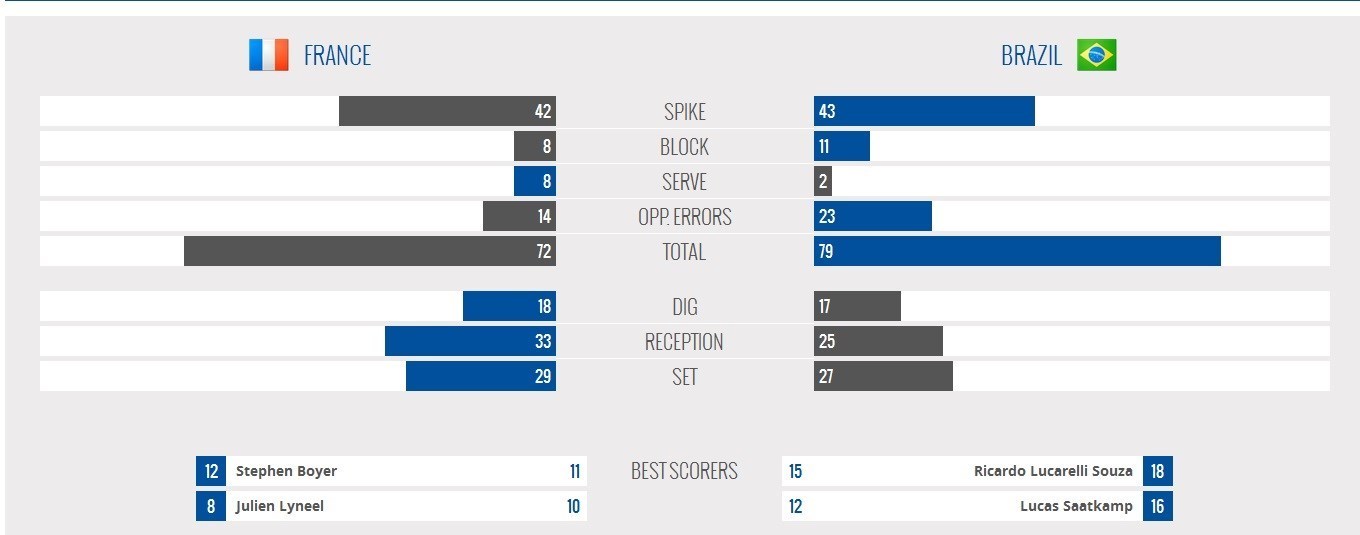 بازیکنان برزیل در 3 ست متوالی این بازی با نتایج 27 بر 25، 27 بر 25 و 25 بر 22 قهرمان لیگ جهانی 2017 را شکست دادند. به این ترتیب، برزیلیها انتقام شکست 3 بر 2 فینال لیگ جهانی را از حریف اروپایی خود گرفتند.