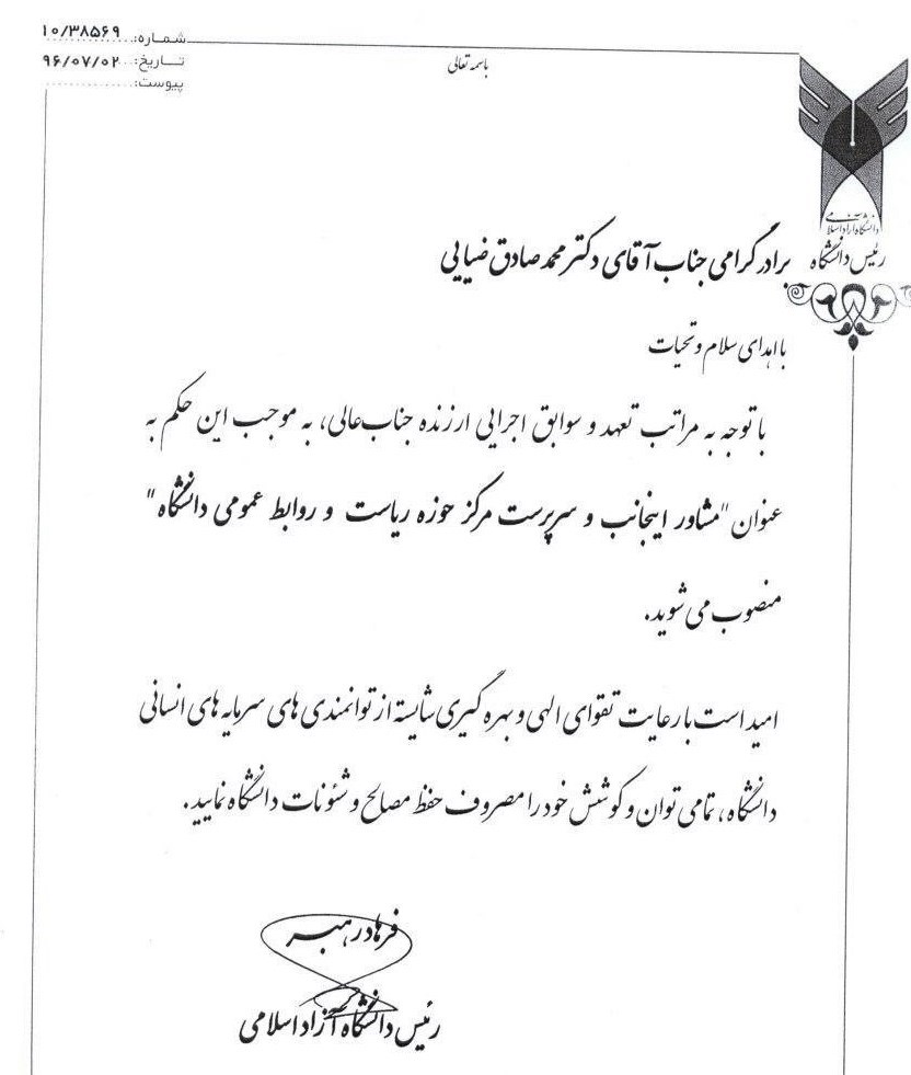 در این حکم آمده است: با توجه به مراتب تعهد و سوابق اجرایی ارزنده جنابعالی به موجب این حکم به عنوان "مشاور اینجانب و سرپرست مرکز حوزه ریاست و روابط عمومی دانشگاه" منصوب می‌شوید.