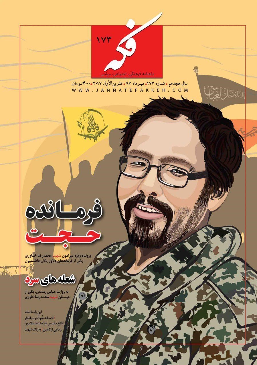 به گزارش باشگاه خبرنگاران پویا, صد و هفتاد و سومین شماره ماهنامه «فکه» منتشر شد. نقشه راه(اینفوگرافیک بیانات مقاممعظمرهبری), زبان گویای انقلاب اسلامی در شبه قاره هند(درنگی در سیره انقلابی شهید علامه سیدعارف حسین حسینی، رهبر شیعیان پاکستان), بی سروصدا (به مناسبت سالگرد شهادت شهید مجید سیلاوی مسئول عملیات تیپ37نور), به رنگ شهید(مصاحبه با احمد منصوب، هنرمند و نقاش مشهدی), داستان انقلاب 4(پایان اعتصابات، آغاز اقدامات)پرونده ویژه شهید مدافع حرم، محمدرضا خاوری یکی از فرماندهان دلاور یگان فاطمیون شامل گفتگو با مادر شهید مدافعحرم محمدرضاخاوری, گفتوگو با محمدجوادخاوری برادر شهید, واگویههای خواهرانه برای برادرم, شعلههای سرد(درباره شهید محمدرضاخاوری، از زبان عباسرستمی از رزمندگان تیپ فاطمیون), کان رضا عماد البیت (حوار مع محمدجواد خاوری),أخ الشهید المدافع عن الحرم محمدرضاخاوری, المشاعل البارده حوار مع عباس رستمی أحد مجاهدی لواء فاطمیون, کشتار پیاپی در میانمار بدون یک ثانیه سکوت، جنگ افزار- ژ-3 و پیشخوان از جمله بخش هایی است که در جدیدترین شماره ماهنامه «فکه» به آن پرداخته شده است.
