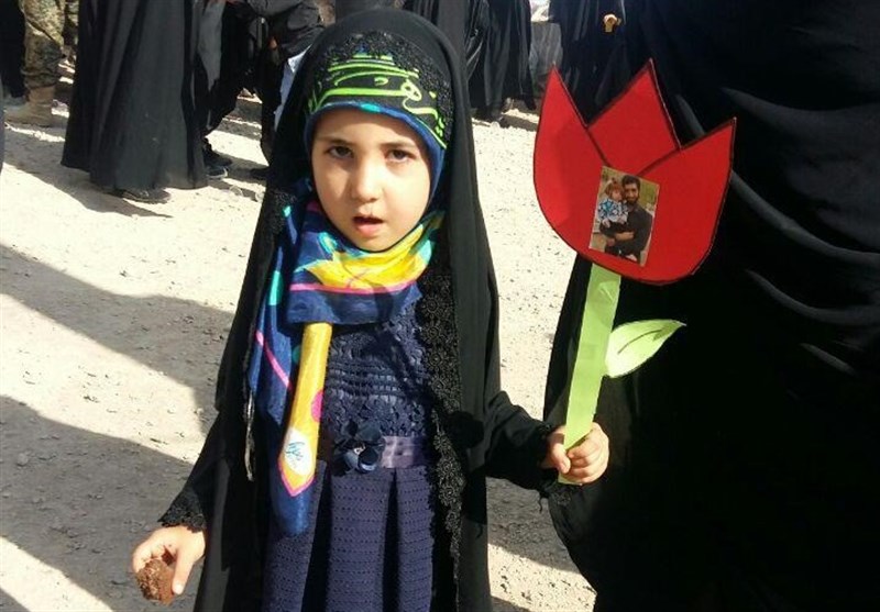 یکی از دختر بچه ها نیز که به گفته مادرش کاردستی گل لاله را با دستان خودش درست کرده و عکس شهید حججی و پسرش را به آن چسبانده است، گفت: «بابای علی قهرمانه، همه باباها قهرمانن و از امام حسین (ع) دفاع می کنند»