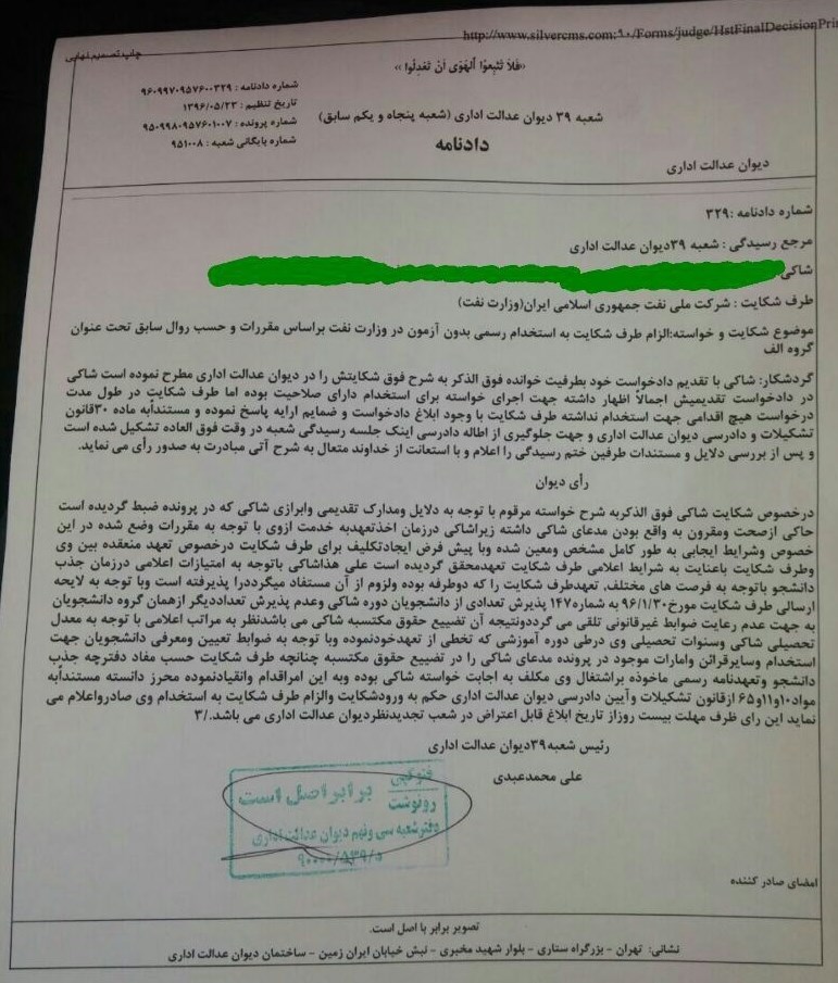 به گزارش خبرنگار گروه دانشگاه خبرگزاری تسنیم، پس از انتشار خبر حکم دیوان عدالت اداری برای مکلف کردن "وزارت نفت" به جذب دانشجویان دانشگاه صنعت نفت، تصویر این حکم منتشر شد.