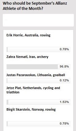 مهلت شرکت در این نظرسنجی در ساعت 12 روز چهارشنبه هفته جاری تمام میشود و این در حالی است که تا این لحظه زهرا نعمتی به عنوان قهرمان جهان و پارالمپیک توانسته 96.8 درصد آرا را به خود اختصاص بدهد و با اختلاف فراوانی نسبت به سایر نامزدها در صدر قرار داشته باشد.