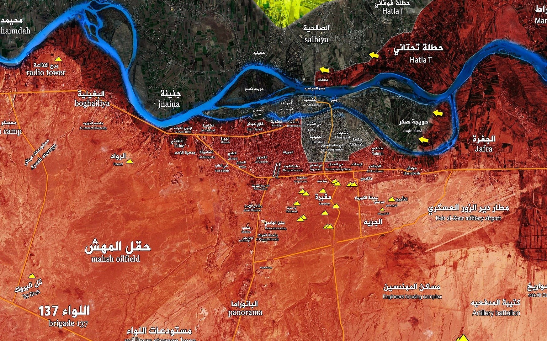 در ادامه عملیات ارتش سوریه و متحدان در دیرالزور، روستای حطله و میدان الحلبیه در ورودی شمال این شهر آزاد شد، عملیات پاکسازی کرانه شرقی رودخانه فرات در سایه پیشروی سریع ارتش و همپیمانان و فرار سرکردگان داعش همچنان ادامه دارد.