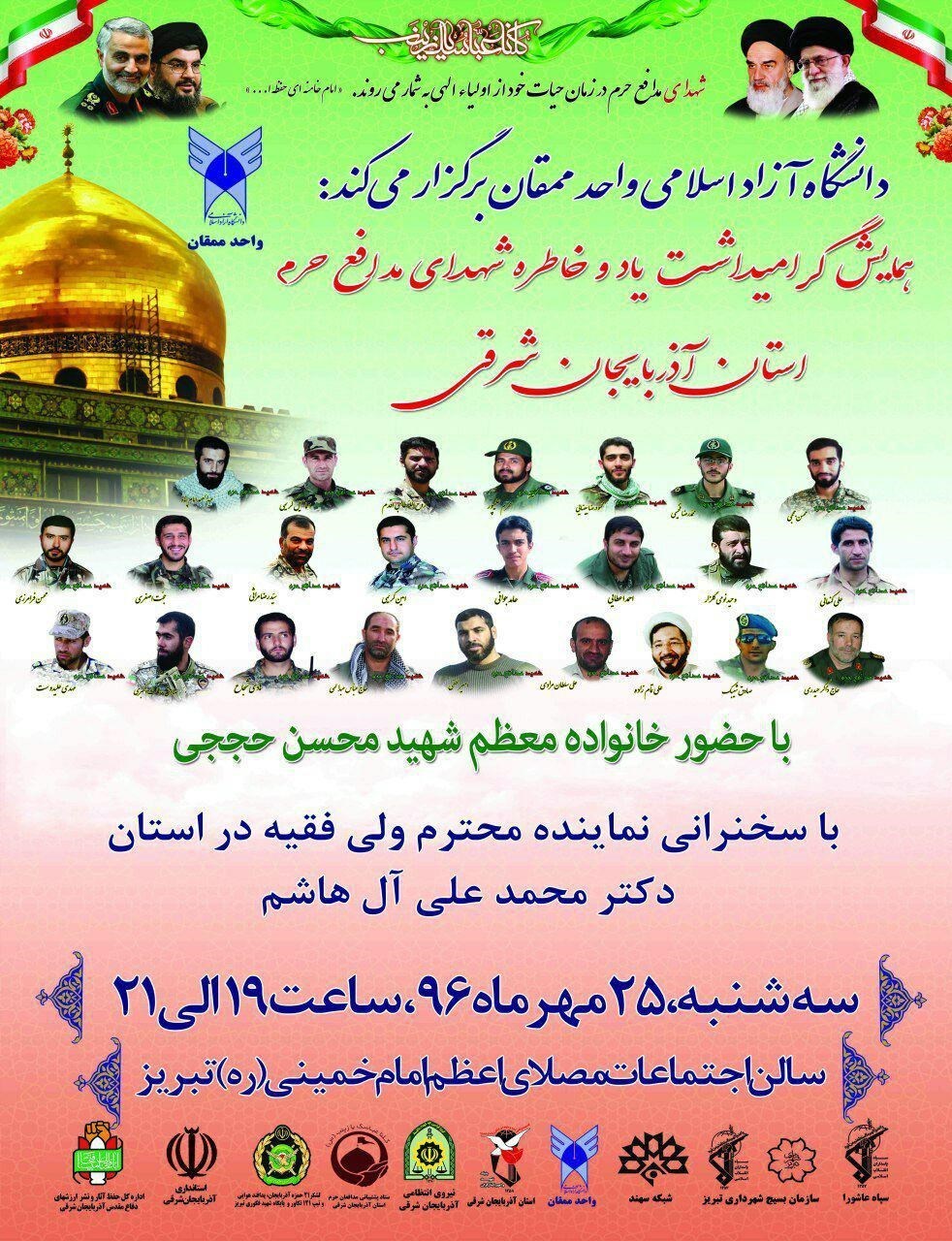 این مراسم با حضور خانواده شهید مدافع حرم «محسن حججی» و سخنرانی حضرت حجتالاسلام «سید محمدعلی آلهاشم» نماینده ولی فقیه در استان و امام جمعه تبریز همراه خواهد بود.